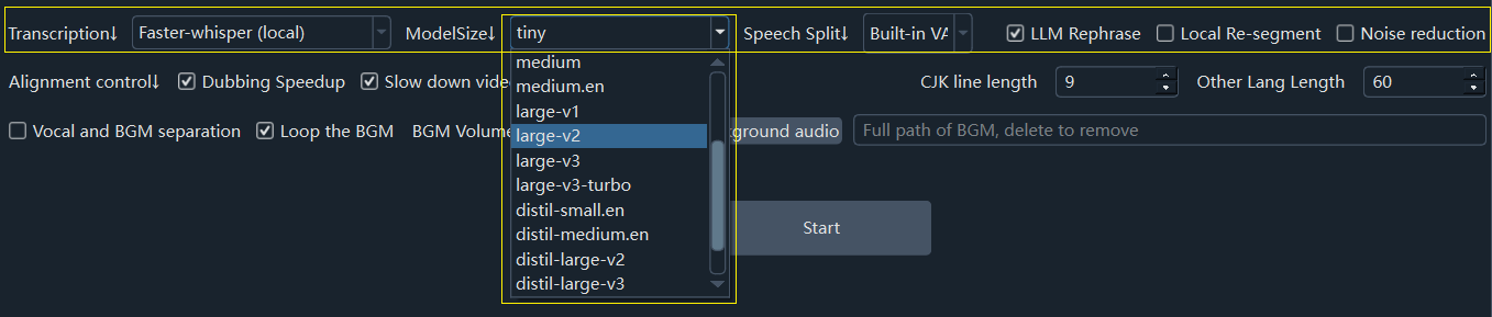 large-v2,large-v3, orlarge-v3-turbo - Select speech segmentation mode