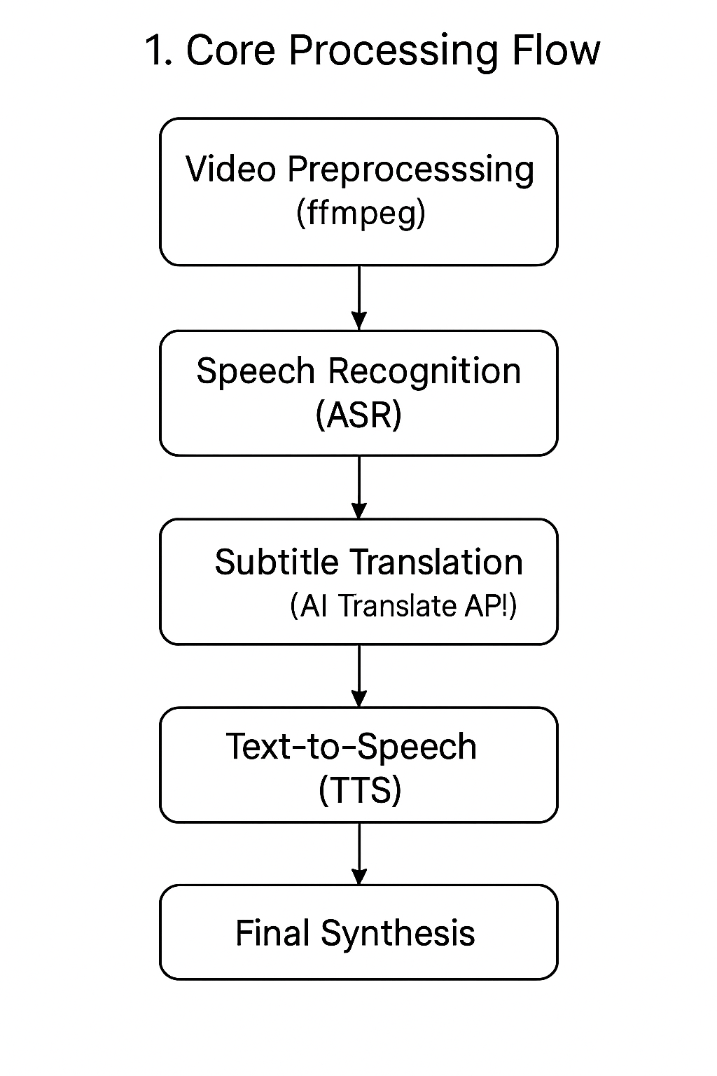 The core functionality of the software is to automatically translate a video and add target-language voiceover. The entire process is broken down into a series of independent steps, forming an automated processing pipeline: