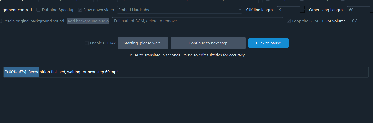 - Example 1: Video to Subtitle Feature This feature only requires speech recognition, so it skips the subtitle translation, dubbing, audio-visual alignment, and merge & embed threads.