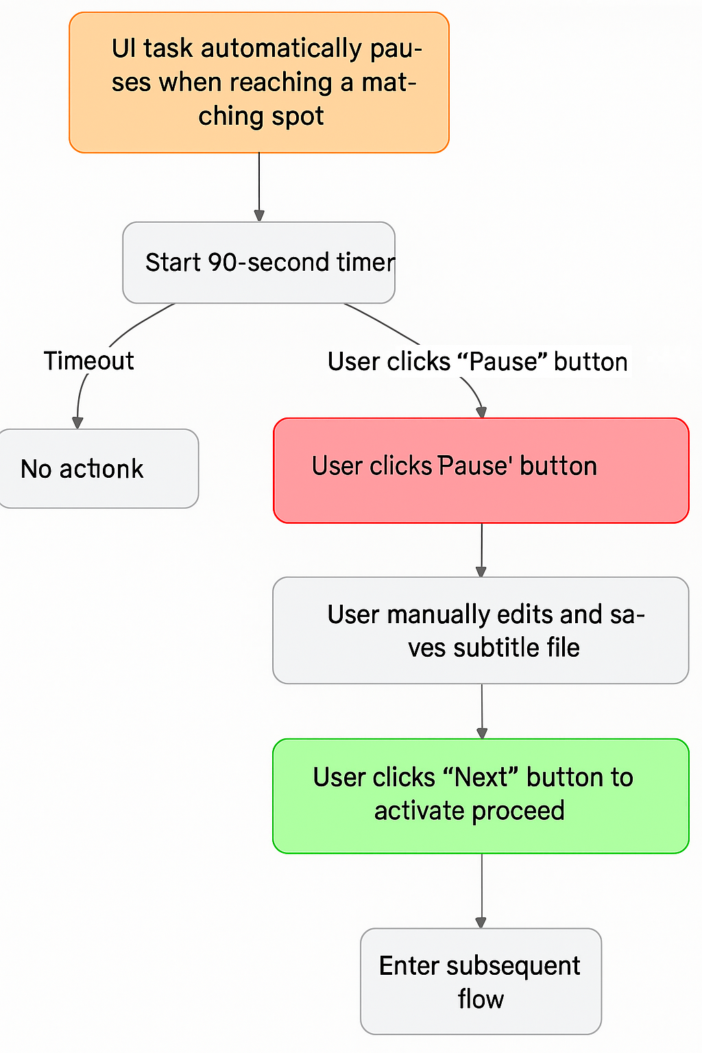- Auto-resume Countdown: Upon pausing, the interface starts a 90-second countdown. If the user takes no action during this time, the task automatically proceeds to the next step after the countdown ends.
